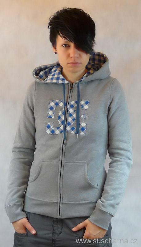 - Z jedné strany šedá mikina s velkým logem DC Shoes na hrudníku v kostkovaných barvách